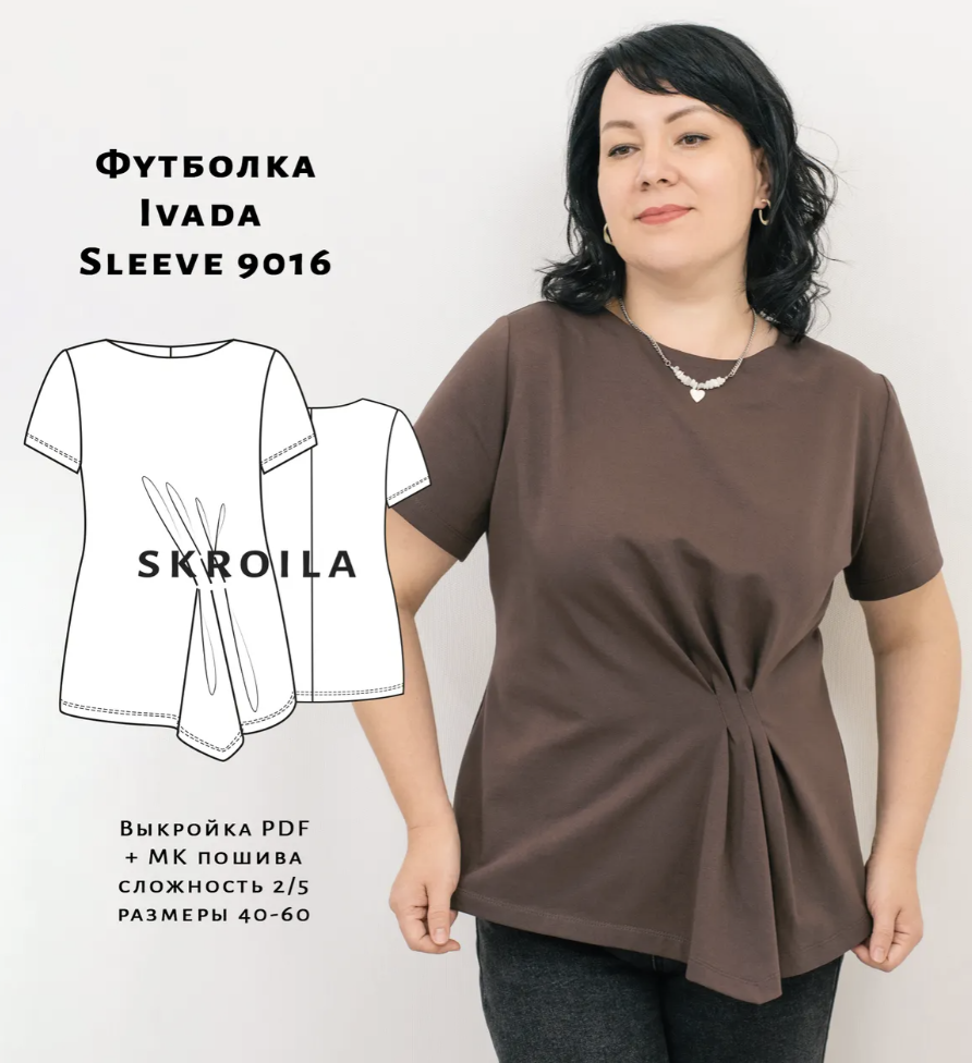 Выкройка футболки с асимметричным кроем. На детали полочки драпировка с 3-мя частично застроченными диагональными складками. Рукав втачной, короткий. На детали спинки средний шов. Горловина лодочка, обработана обтачкой. Длина футболки до бедра.